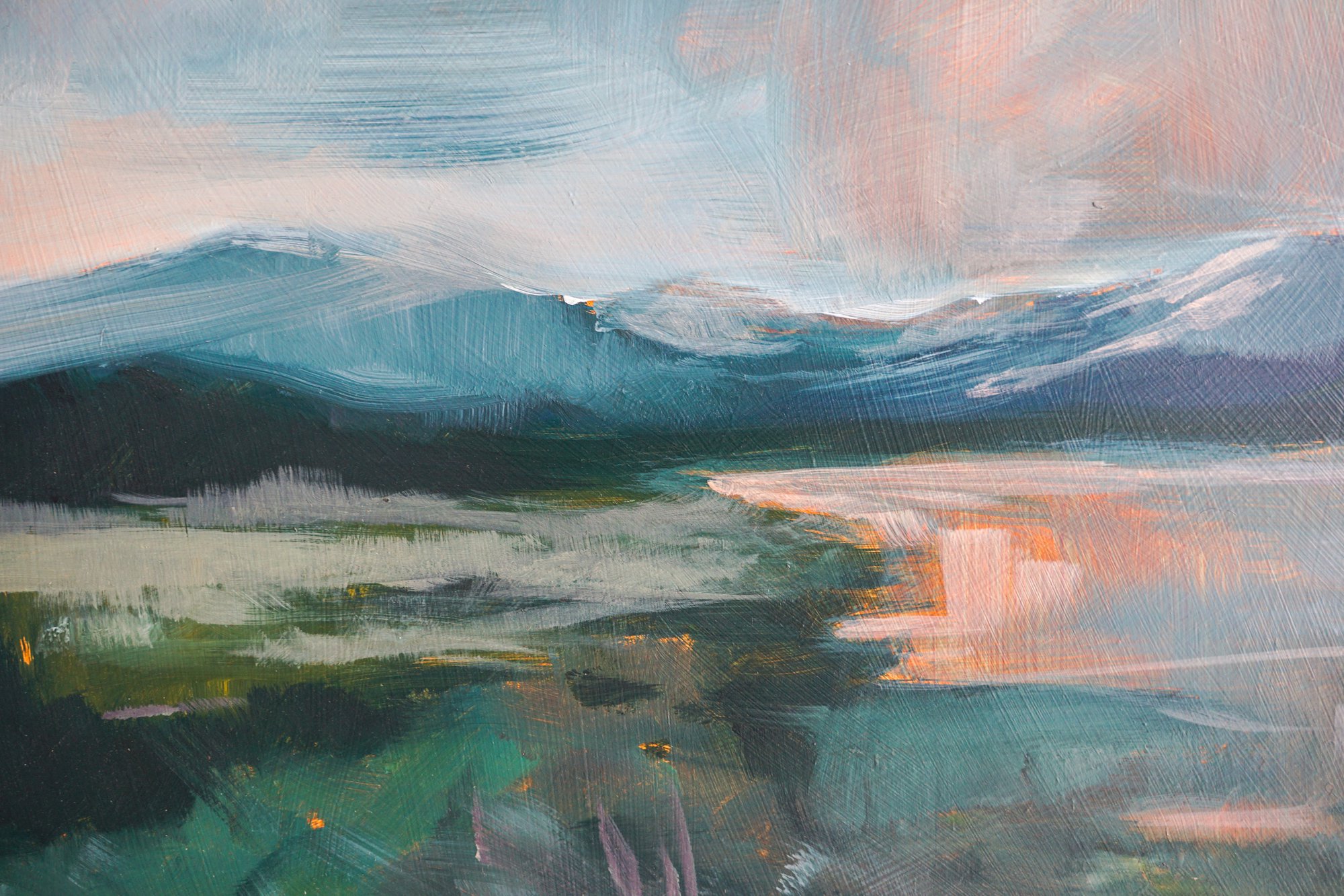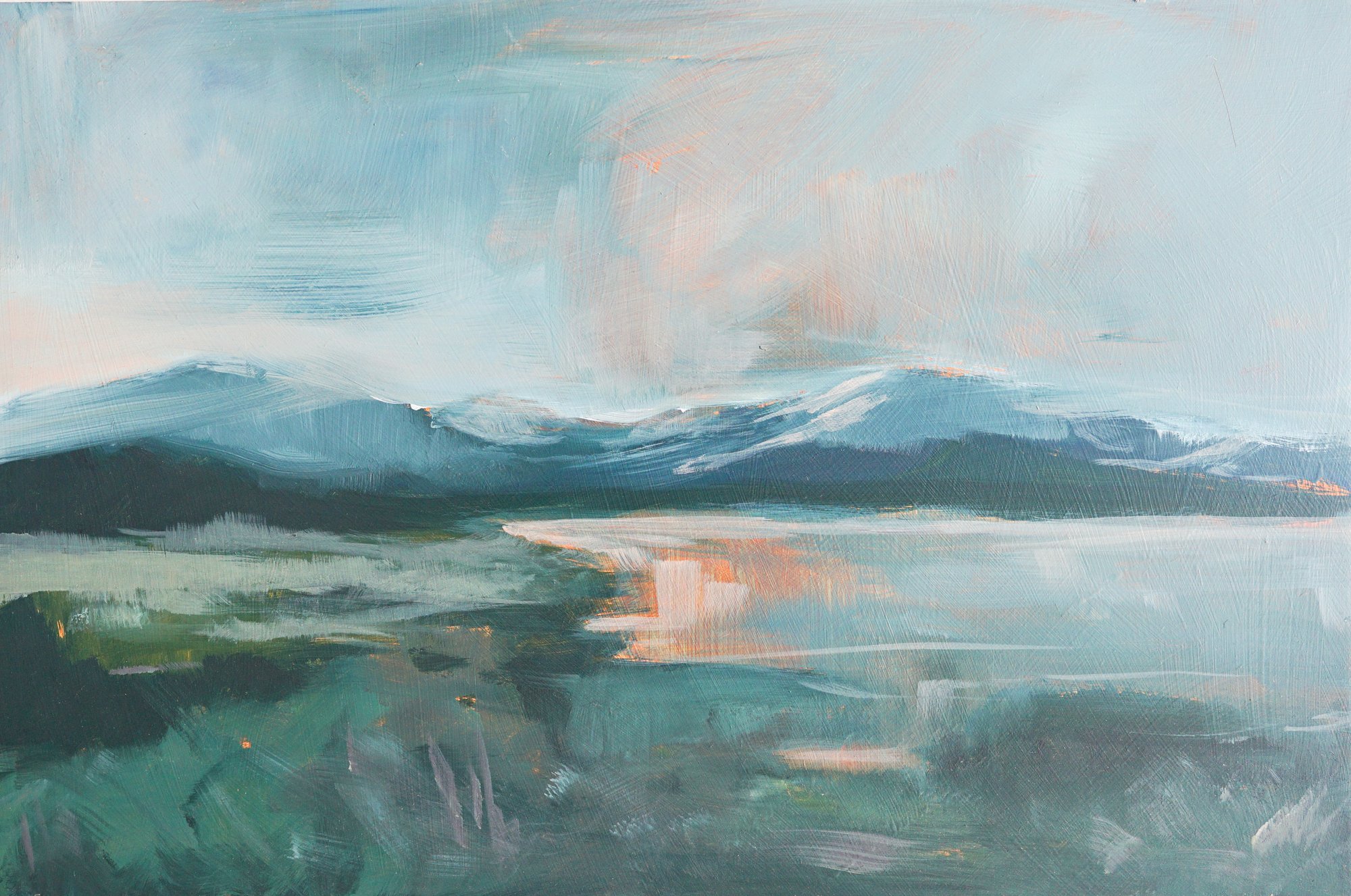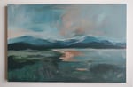 An original acrylic painting of a beautiful evening in the mountains.
