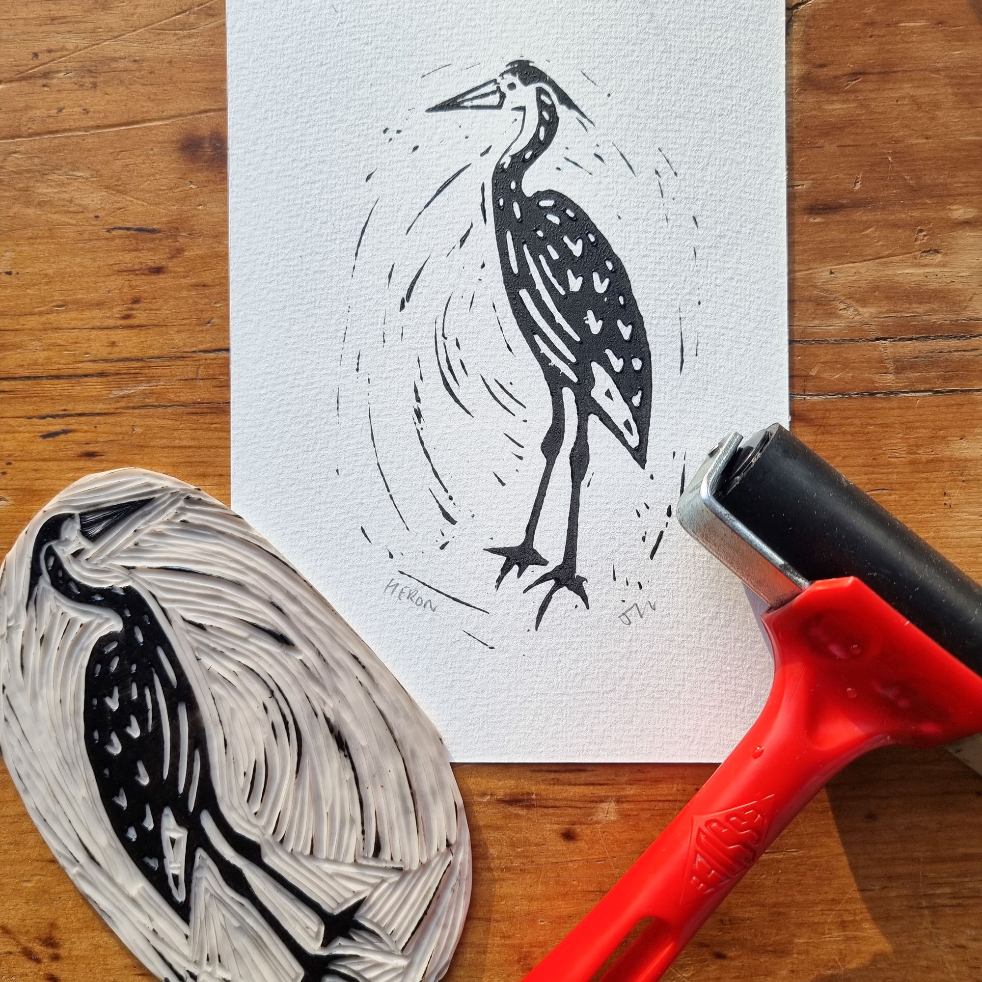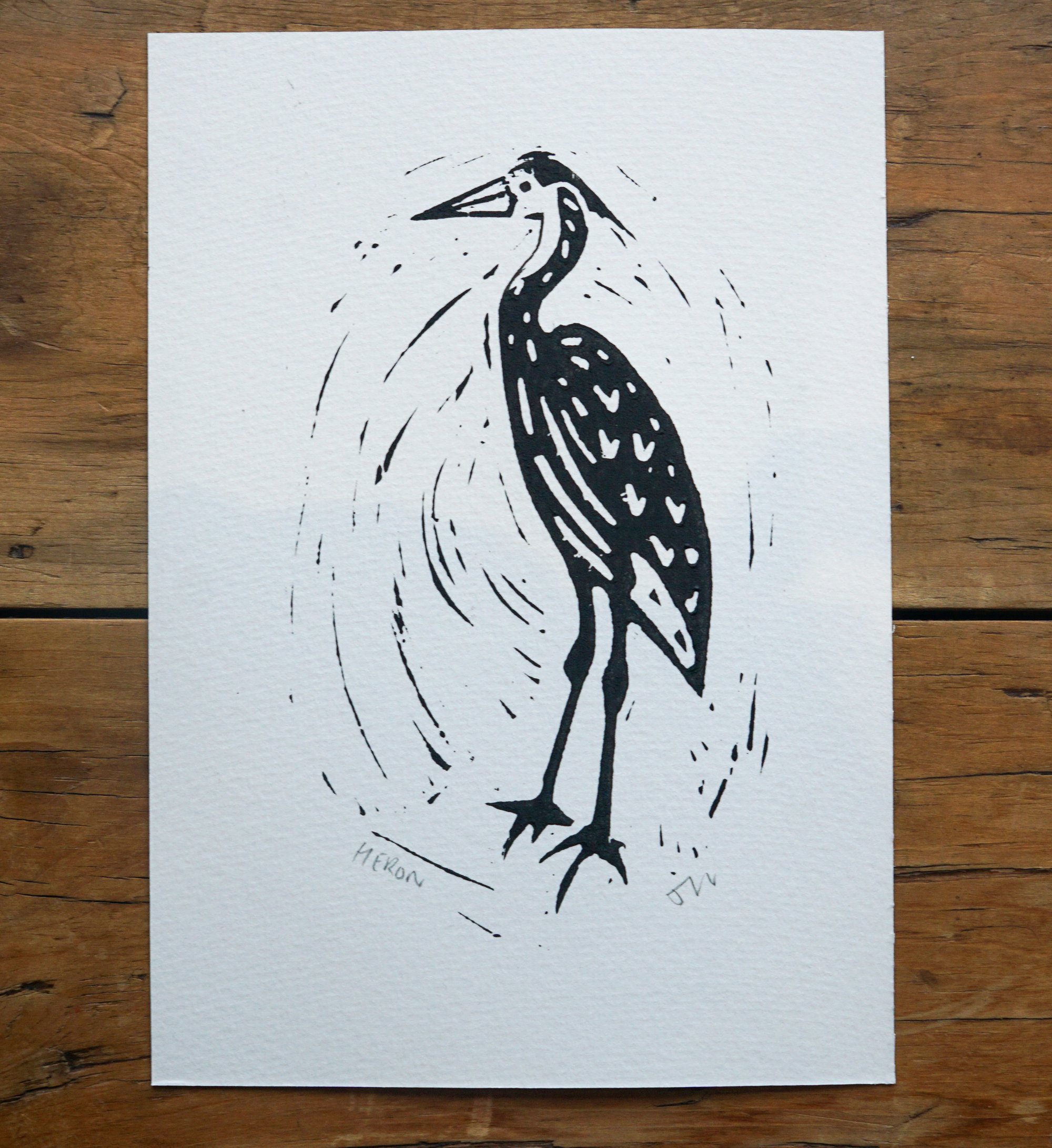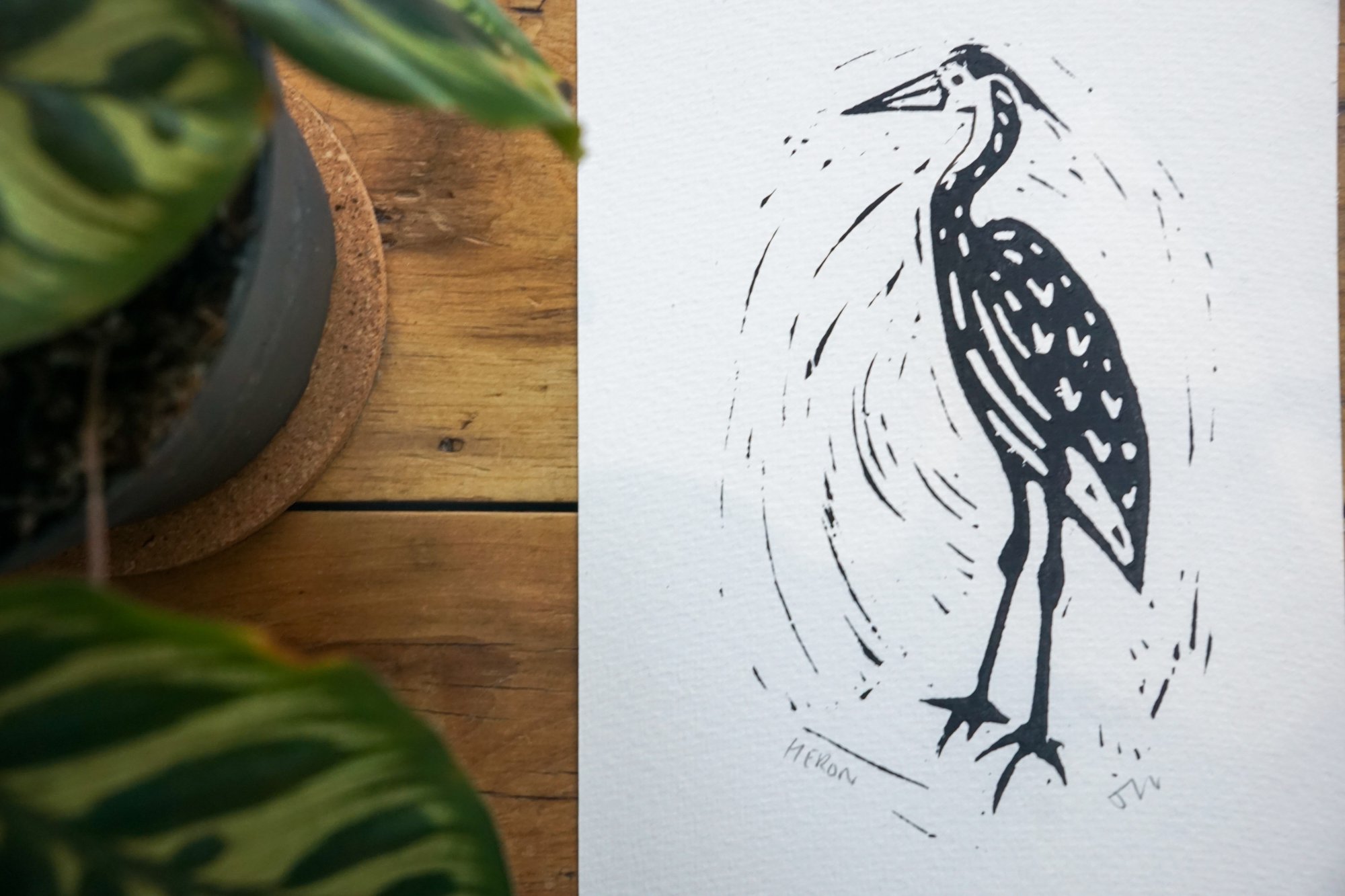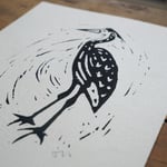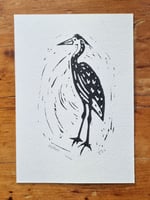 Handmade Lino Print of a Heron on high quality, textured 300gsm watercolour paper.
