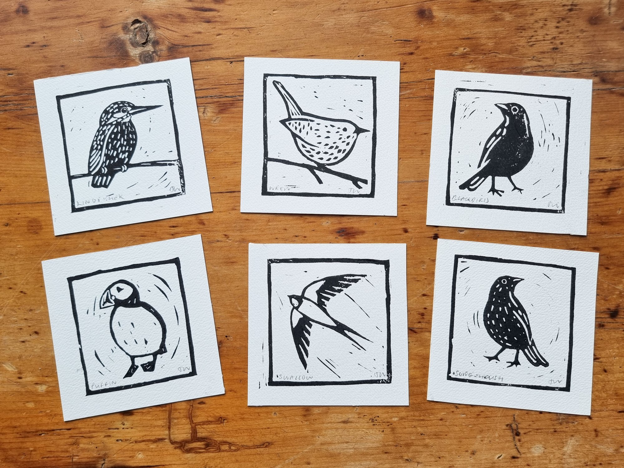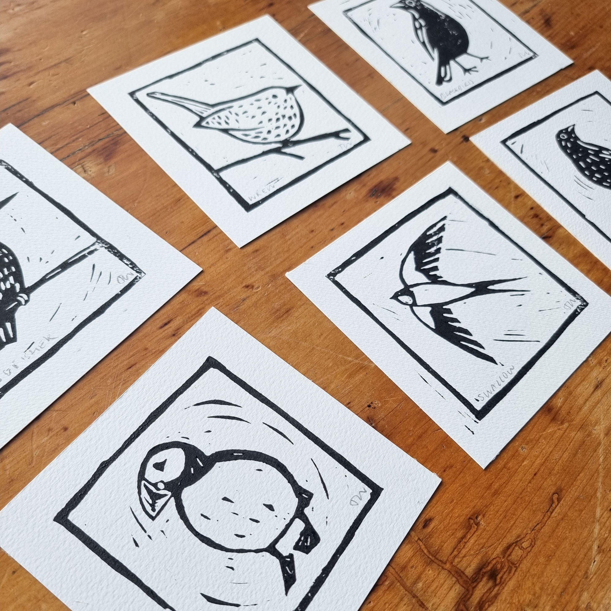 Six handmade Lino Prints of some of my favourite birds, printed on textured 300gsm watercolour paper.