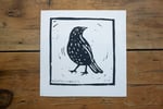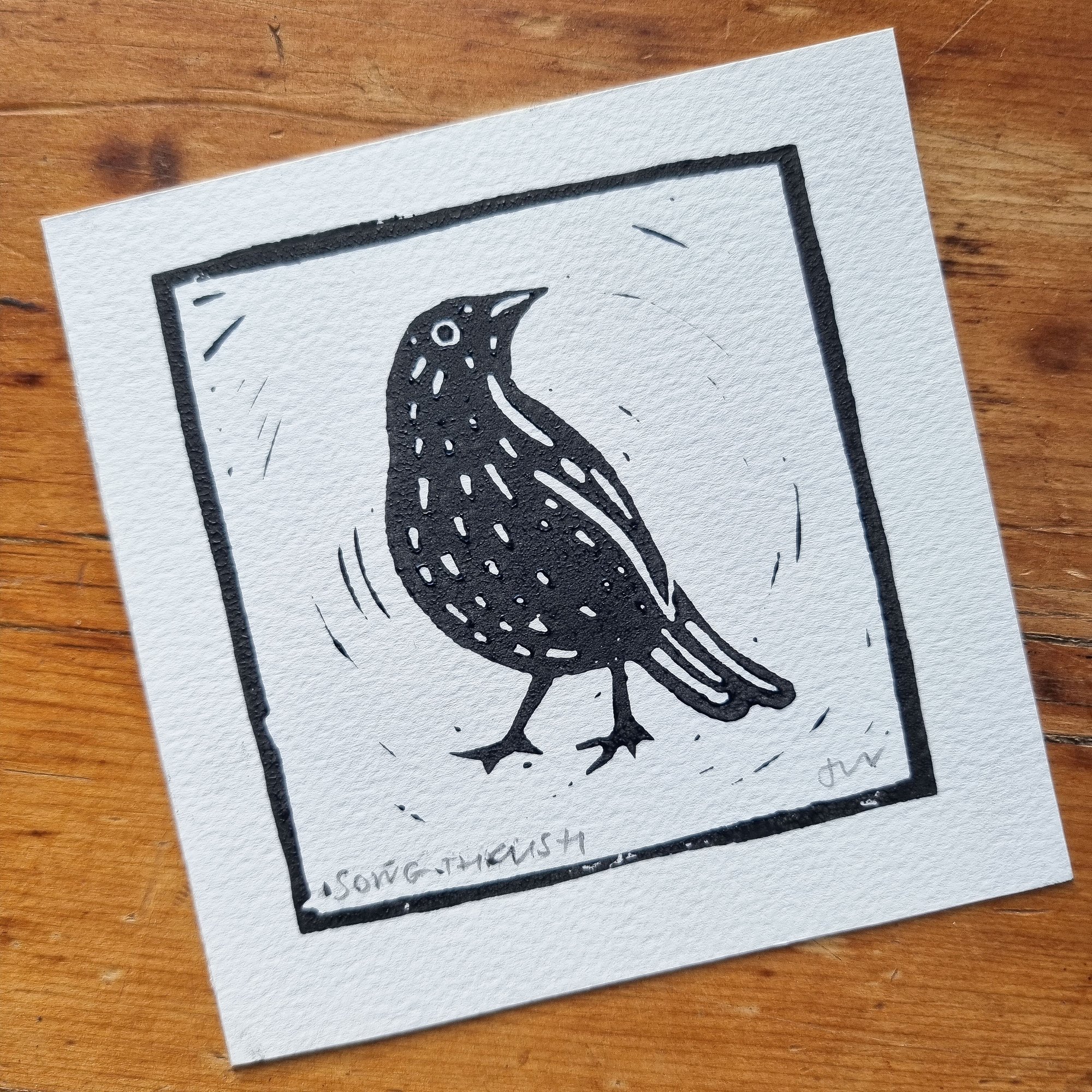 Handmade Lino Print of a Song Thrush on high quality, textured 300gsm watercolour paper.